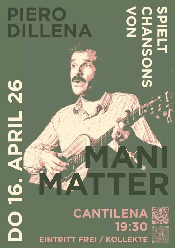 Piero Dillena kehrt auf die Cantilena-Bühne zurück! Wie bereits beim legendären Auftritt vor zwei Jahren, wird er Chansons und Geschichten von und zu Mani Matter spielen. Mit akkustischer Gitarre und autenthischem Berner Dialekt.