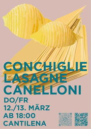 Am Donnerstag und Freitag ab 18.00 Uhr gibt es gefüllte und gebackene Pasta in der Cantilena! Es wird ein grosses Buffet geben mit Selbstbedienung - bei dem alle nach Lust und Laune auswählen können: Conchiglie mit Ricotta und Dörrtomaten; Zitronen-Lauch-Canelloni; Soya-Lasagne (vegan); Spinat-Cashew-Canelloni (vegan), Champignon-Erbsen-Conchiglie (vegan), Conchiglie mit Gorgonzola, Birne und Walnuss